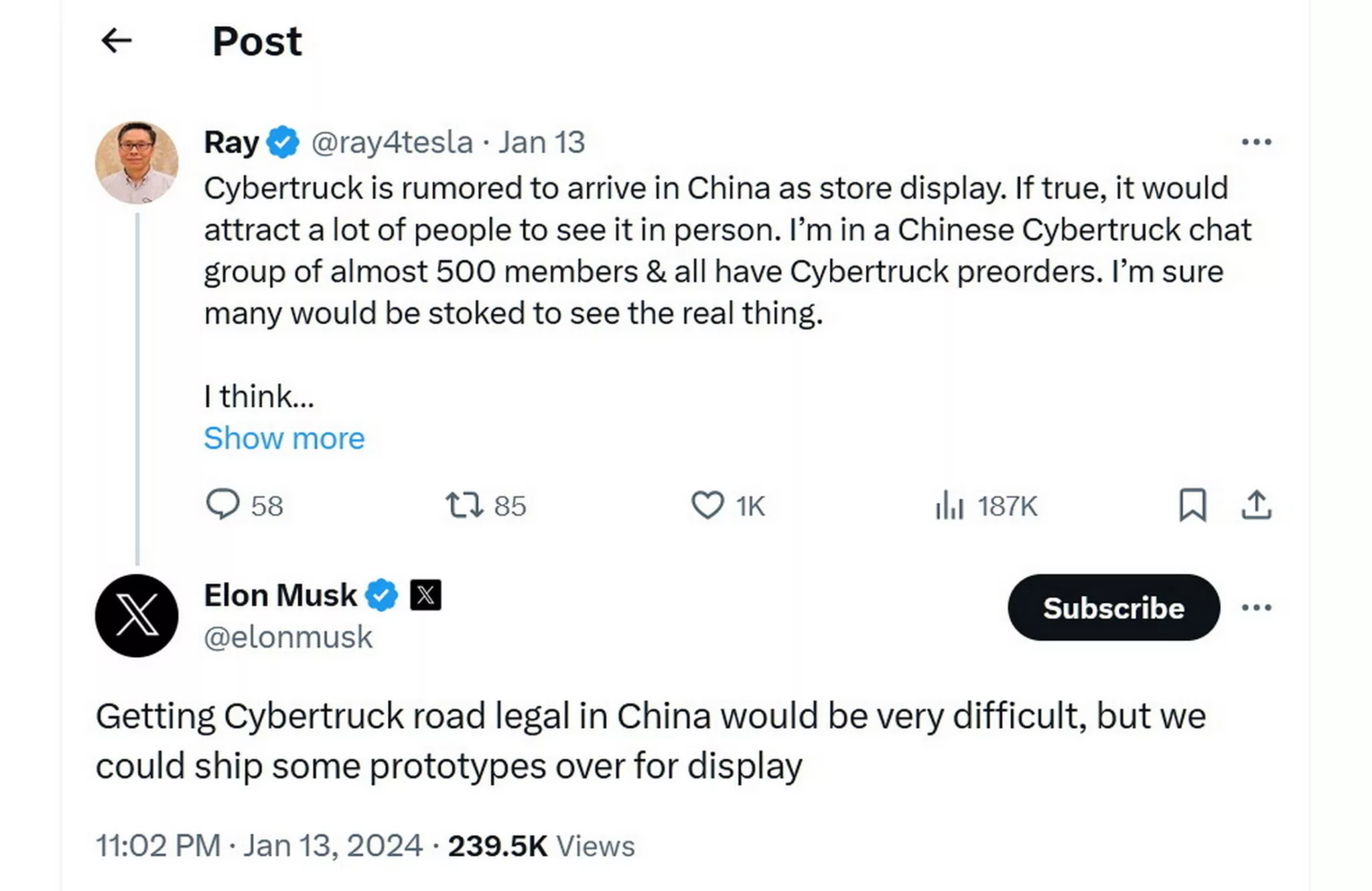 Tuy nhiên, bài đăng của ông cũng ngụ ý rằng thiết kế độc đáo của Cybertruck có thể tạo ra thách thức trong việc bán hàng tại thị trường khổng lồ của Trung Quốc, nơi Tesla đang gặp phải sự cạnh tranh quyết liệt với BYD trong cuộc chiến về doanh số.