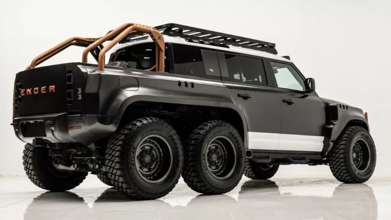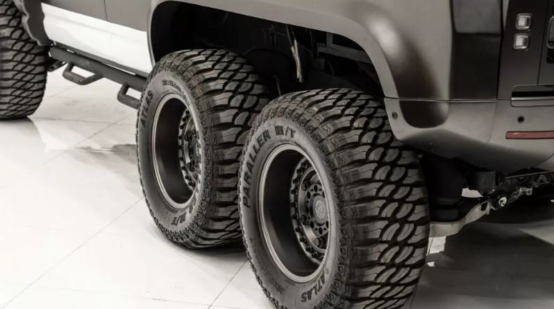 Điều đặc biệt là hai bánh xe này không chỉ mang tính chất thẩm mỹ mà còn tham gia vào hệ thống dẫn động, biến Defender thành một chiếc xe 6 bánh đích thực. Điều này khác biệt hoàn toàn so với nhiều mẫu xe 6×6 giá rẻ trên thị trường chỉ gắn bánh phụ mà không có chức năng dẫn động.