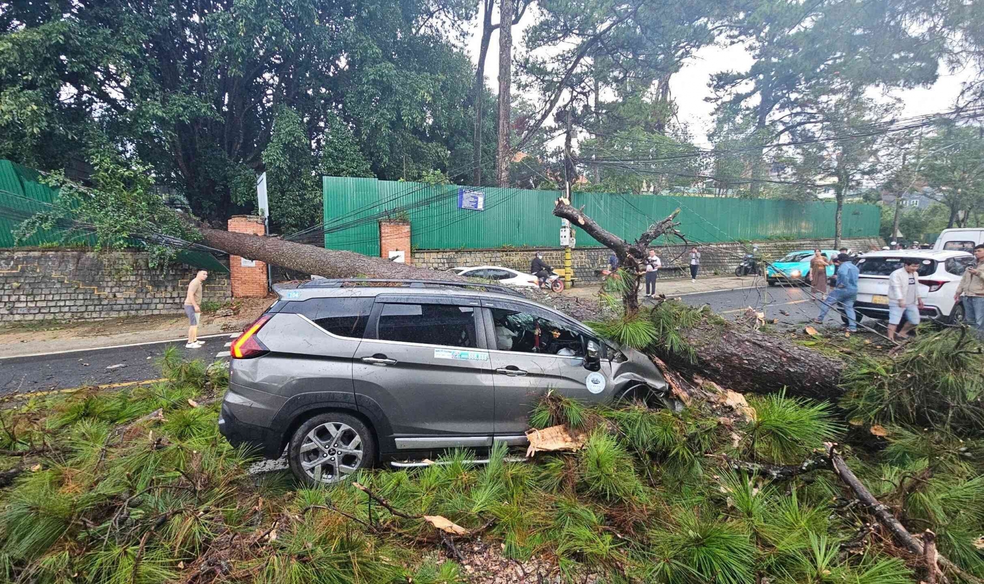Không chỉ ngập nước, mưa bão còn đi kèm gió giật mạnh khiến cây xanh, biển quảng cáo, cột điện bị gãy đổ, gây thiệt hại đáng kể cho các phương tiện đang dừng, đỗ bên đường.