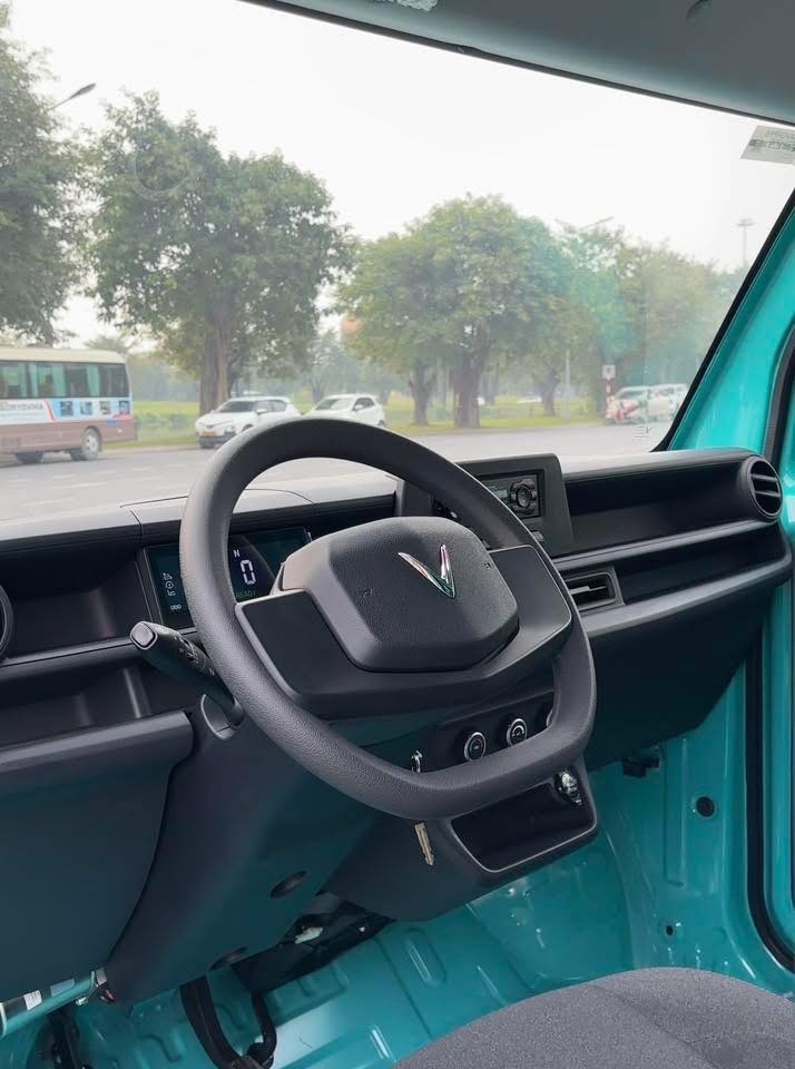 Vô lăng kiểu VF 3 kết hợp cần chuyển số phía sau, cùng màn hình hiển thị thông tin tối giản cung cấp dữ liệu pin, tốc độ, hành trình và mức tiêu hao điện năng. VinFast tiếp tục sử dụng phanh cơ truyền thống để đơn giản hóa bảo dưỡng.