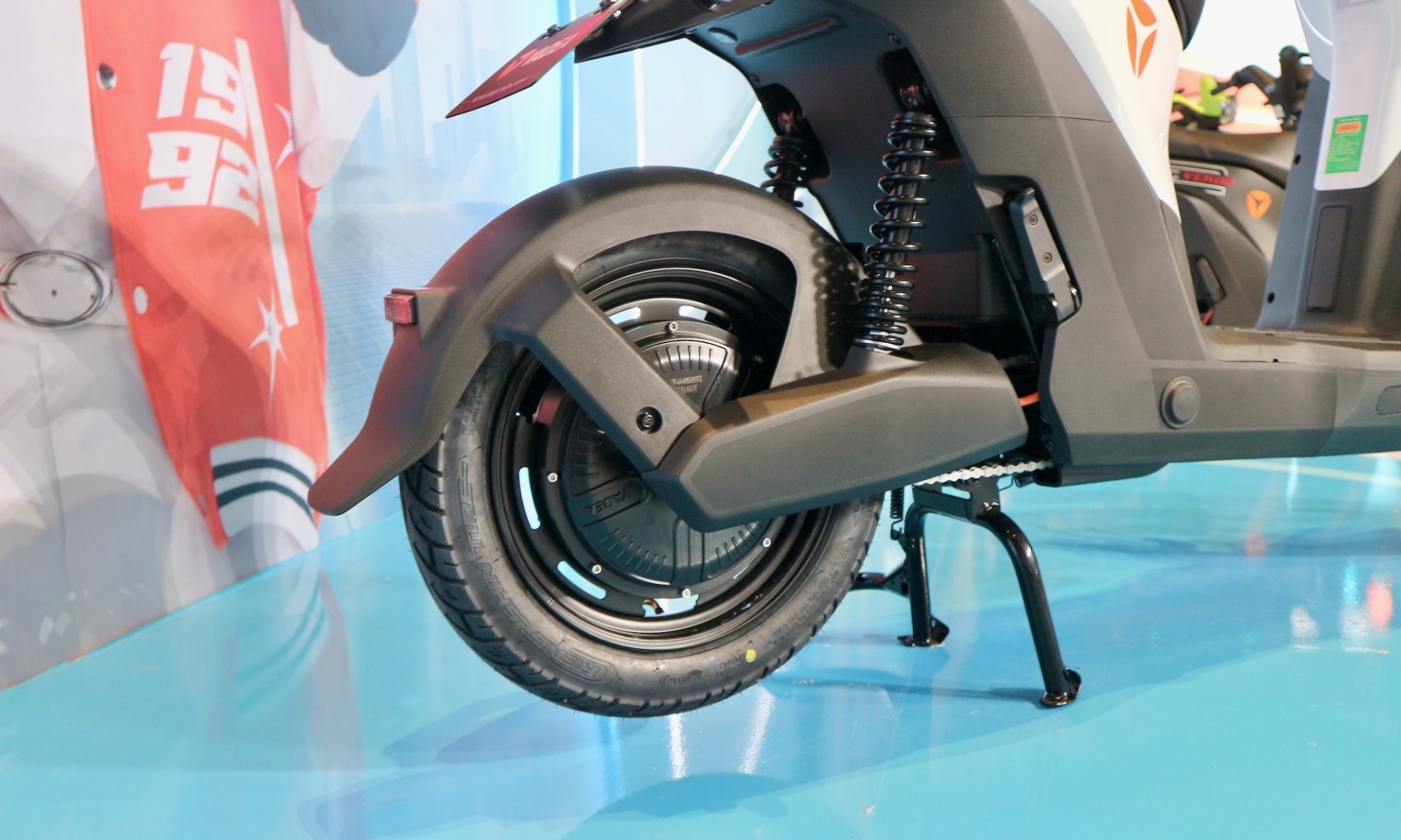 Hệ thống phanh gồm phanh tang trống ở cả bánh trước và sau. Lốp xe là loại không săm kích thước 12 inch.