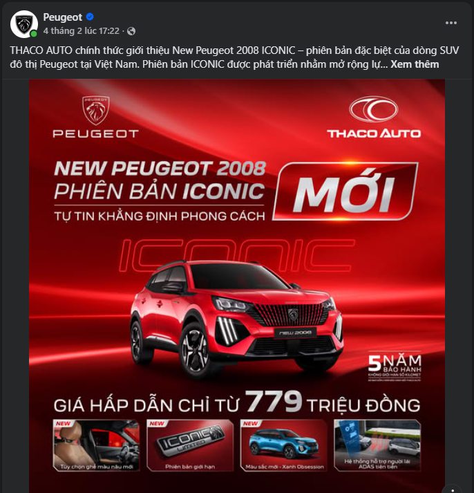 Sau khi phiên bản nâng cấp của Peugeot 2008 được ra mắt tại Việt Nam đầu năm 2025 với mức giá cao, phản hồi thị trường chưa thật sự tích cực. Trước bối cảnh đó, Peugeot đã nhanh chóng điều chỉnh chiến lược bằng cách đưa vào danh mục một phiên bản tiêu chuẩn mới mang tên Iconic, có giá khởi điểm 779 triệu đồng.