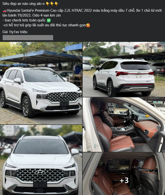 Theo thông tin từ một showroom chuyên bán xe đã qua sử dụng, một chiếc Hyundai Santa Fe 2022 phiên bản Premium máy dầu đang được rao bán với giá khoảng 1,1xx tỷ đồng. Xe đã lăn bánh 40.000 km kể từ khi đăng ký vào tháng 9/2022, ngoại thất màu trắng và nội thất màu nâu.